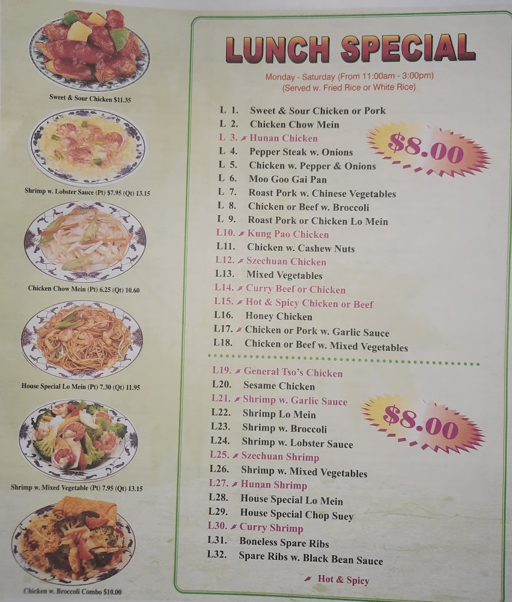 The menu caters well to those looking for familiar flavors prepared with care, making it easy to enjoy a relaxed meal any time of day. From lighter lunch specials featuring Sweet & Sour Chicken or Chicken Chow Mein to more filling choices like Pepper Steak with Onions or Moo Goo Gai Pan, the dishes fit naturally within a welcoming, family-friendly atmosphere.