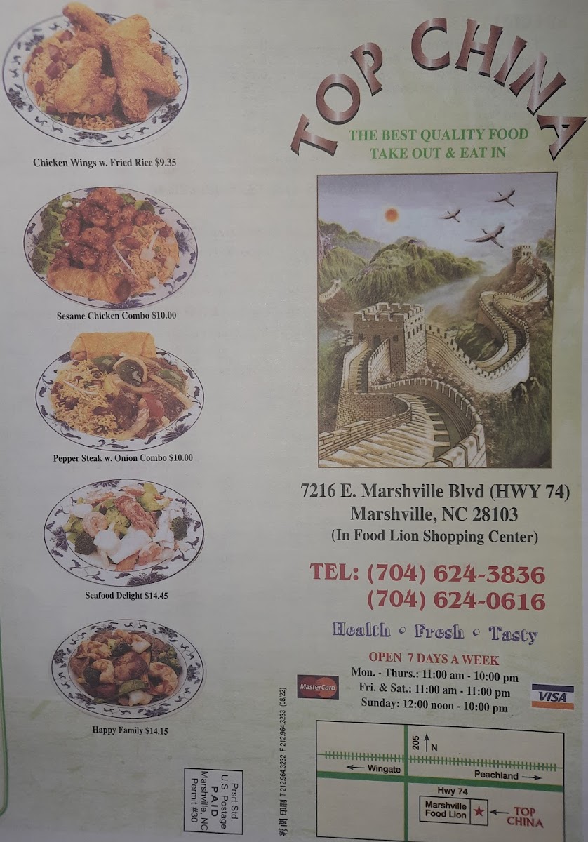 Top China's menu offers a straightforward selection of classic Chinese and Asian dishes, designed to satisfy a variety of everyday dining moments. Whether you’re stopping by for a quick lunch or settling in for a casual dinner, you’ll find comforting options like warm Wonton Soup, flavorful Shrimp with Lobster Sauce, and hearty combos such as Sesame Chicken and House Special Lo Mein.